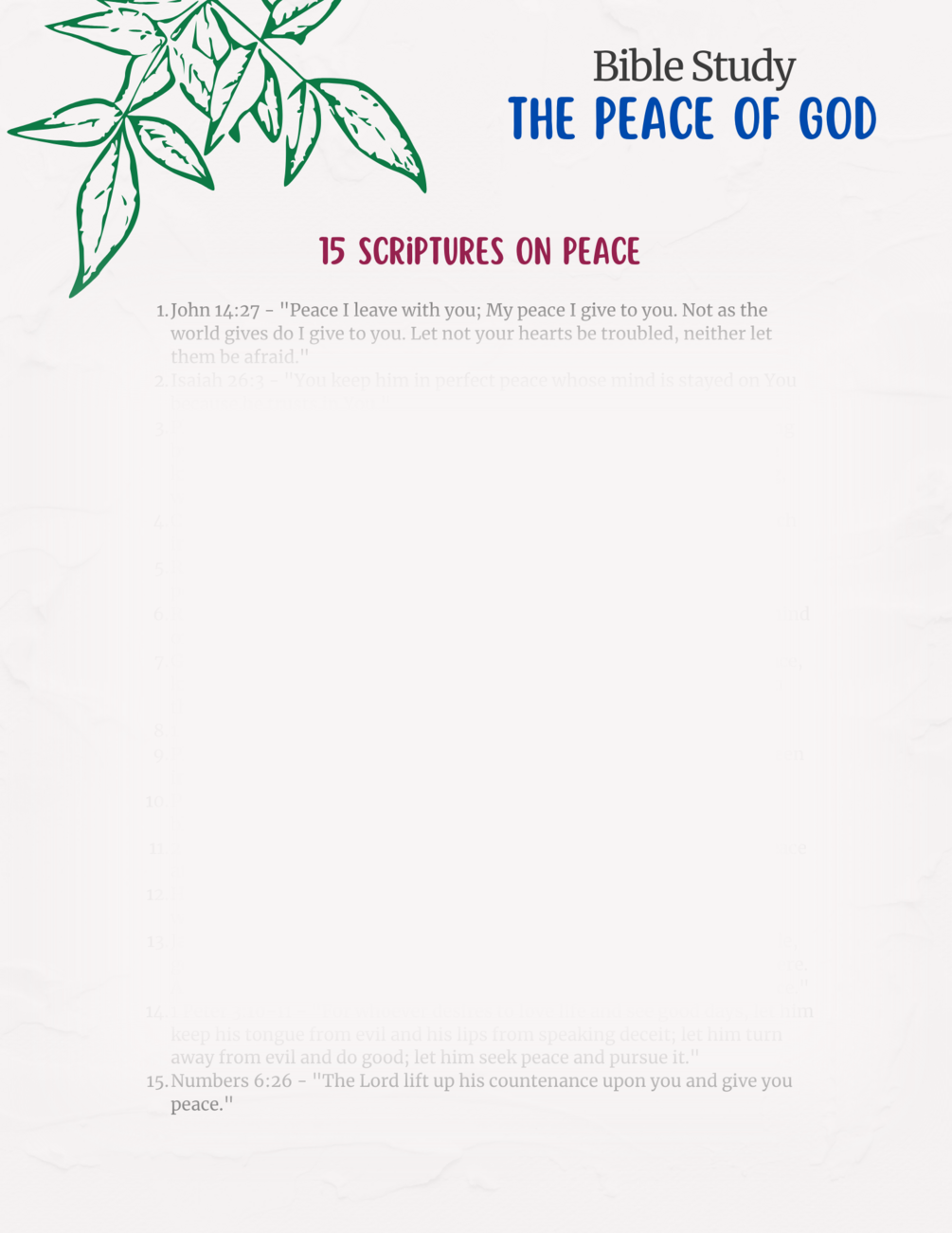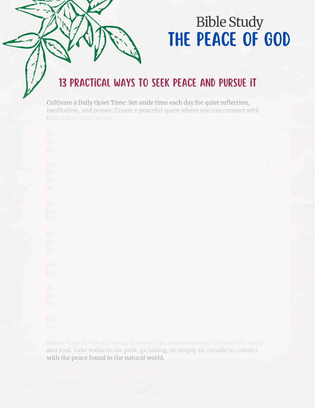 13 practical ways to seek peace and pursue it, how to obtain peace, the benefits of God's peace, how to apply peace in every area of life, I will give you over 20 verses concerning God's peace, plus reflection questions and so much more!